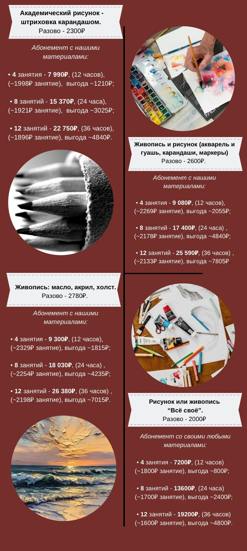 Запись осуществляется на выбор, если Вам удобен предложенный день и время, при наличии свободного места, запишем Вас. Посещать можно независимо от других студентов, рисуя свою картину, 1,2,3 и более раз в неделю, в рамках действия абонемента.